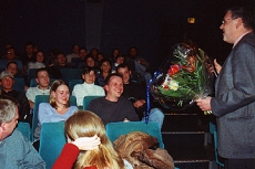 die vor dem Hauptfilm mit einem Blumenstrauß und einem Restaurant-Gutschein