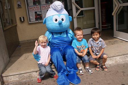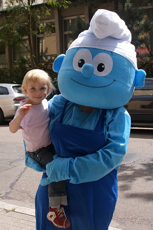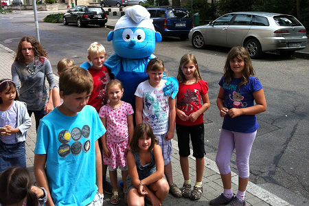 ein "echter Schlumpf in Lebensgröße" unsere kleinen Kinogäste,