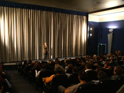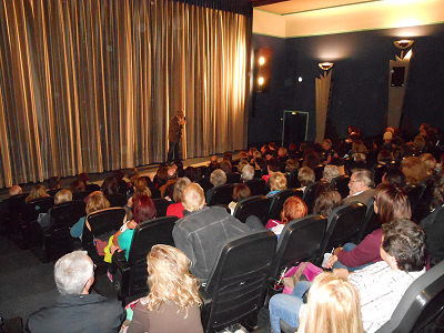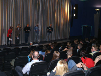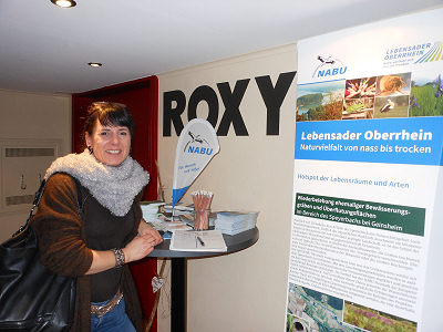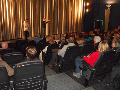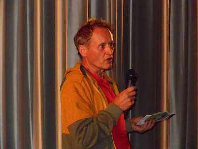 Scherrer vom BUND Neustadt mit den Kinobesuchern und beantwortete Fragen.