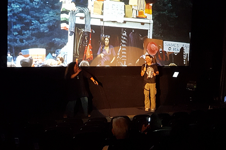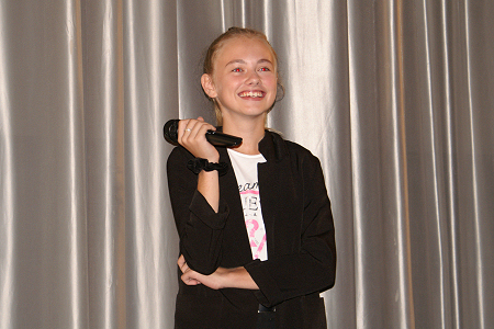 Rojo, eine der Hauptdarstellerinnen aus dem Film auf der Bühne begrüßen.