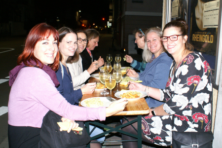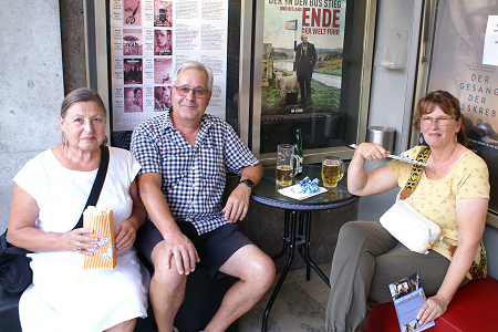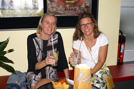 den beiden Filmen im Freien sitzen und die Pasta vom Restaurant Rosengarten