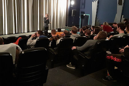 Online-Filmgespräch auf die Leinwand zugeschaltet, bei dem Fragen an den